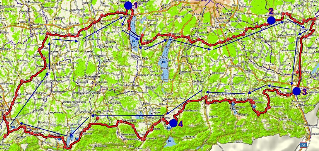 Aufgrund negativer Erfahrungen während der letzten Tour hatte ich beschlossen, die Bereiche Chiemsee und München komplett zu meiden. Diese Anpassung führte zu einer Verkürzung der Tour um eine Etappe mit rund 130 km.