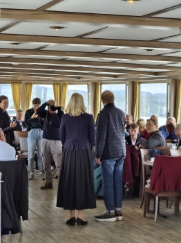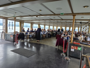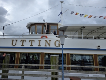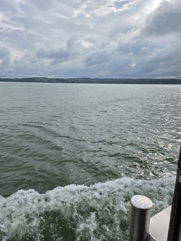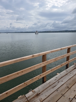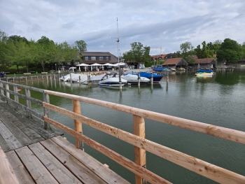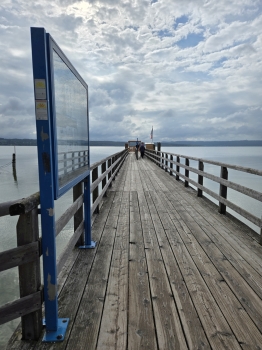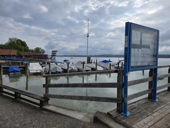 Ich traf frühzeitig am Anleger ein, sodass ich nur etwa 10 Minuten warten musste, bis das Ausflugsschiff eintraf. Da es sich um Christi Himmelfahrt (Vatertag) handelte, war die Stimmung an Bord bereits lebhaft. Eine Live-Band spielte Musik, und kurz darauf ergriff Hans-Jürgen Buchner, bekannt als Haindling, das Mikrofon. Er sprach über sein künstlerisches Schaffen als Musiker und seine Tätigkeit als Töpfermeister für Keramik und Porzellan. Nach etwa 30 Minuten erreichten wir Herrsching, auf der gegenüberliegenden Seite des Ammersees. Das wechselhafte Wetter begleitete mich weiter auf meiner Fahrt bis nach Grafing bei München.