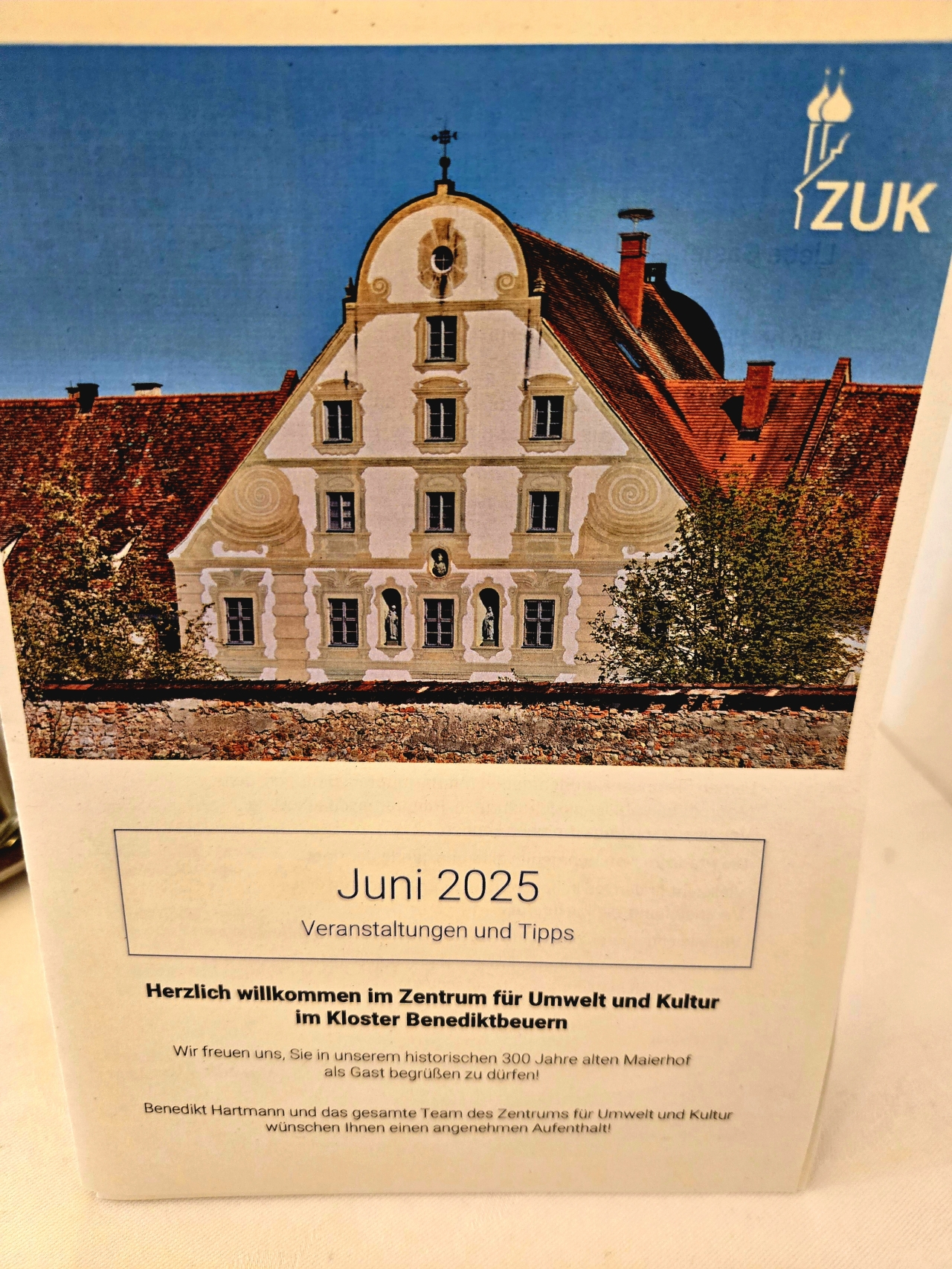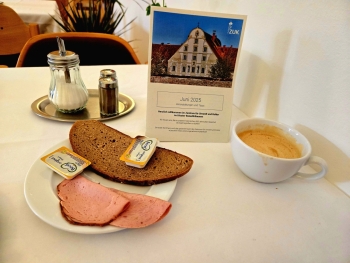 Der Frühstücksraum befand sich in einem separaten Gebäude gegenüber dem klösterlichen Schlaftrakt. Gegen 8:15 Uhr betrat ich den ersten Teil des Raumes, der bereits gut besucht war. Hier befand sich das reichhaltige Buffet, das eine große Auswahl an Getränken und Speisen bot. Im zweiten Raum fand ich meinen eingedeckten, namentlich gekennzeichneten Tisch, an dem ich es mir gemütlich machte. Nachdem ich meinen Teller zweimal mit Leckereien aufgefüllt hatte, machte ich mich gegen 8:45 Uhr auf, um mein E-Trekkingbike zu holen.