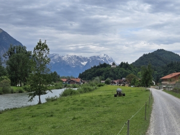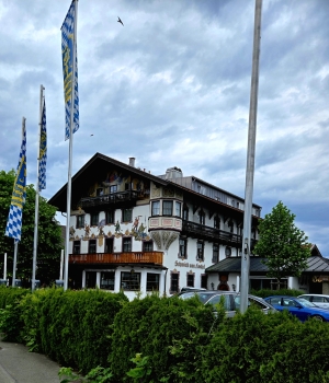 An der Rezeption beglich ich meine Rechnung und nahm die geladenen Akkus in Empfang. Nachdem ich das Bike beladen hatte, verließ ich gegen 9:00 Uhr die Klosteranlage. Kurz darauf fuhr ich wieder in die offenen Wiesenlandschaften. Der Himmel war bedeckt und ein leichter Nieselregen setzte ein. Bald erreichte ich Kochel am See, wo ich bereits bei der ersten Ronda Grande Bavaria im Gasthof Schmied von Kochel übernachtet hatte.